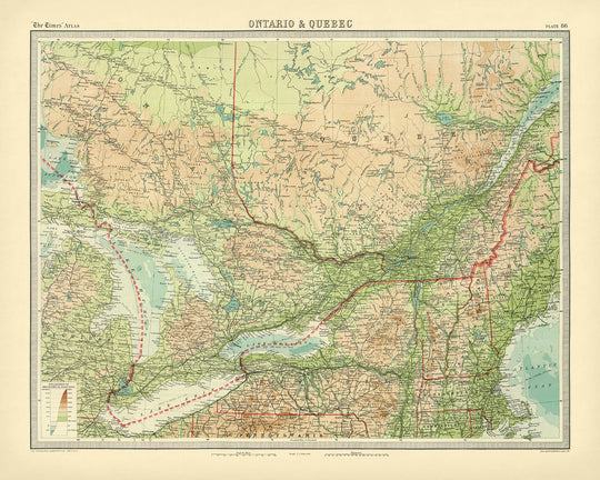 Bartholomew’s artistry and scientific rigor are immediately evident in the map’s design. Utilizing hypsometric shading, he masterfully conveys the undulating terrain of the Canadian Shield, the rolling Laurentian Mountains, and the intricate river systems that thread through the landscape. Bathymetric tints in the Great Lakes and Hudson Bay offer a nuanced depiction of water depths, a feature that not only enhances visual appeal but also underscores the map’s practical utility for maritime navigation. Every contour and color gradient reflects Bartholomew’s commitment to clarity and accuracy, hallmarks of the Times Atlas series that set new standards for cartographic excellence.