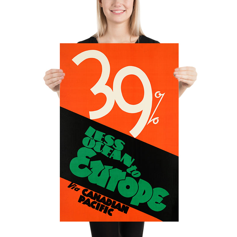 “39% less ocean to Europe via Canadian Pacific” is a striking antique travel poster by an anonymous studio designer working for Canadian Pacific’s publicity department. Created in the golden age of ocean‑liner and railway promotion, it distills a complex travel promise into a single, memorable claim: by crossing Canada by rail and sailing the Atlantic from the East Coast, you spent far less time at sea on your way to Europe. A diagonal black sash cuts across a vivid orange field while a towering white “39%” anchors the composition—pure Art Deco confidence aimed at travelers choosing Canada as their quickest bridge to Europe.