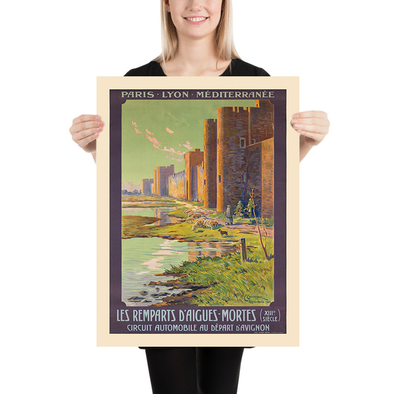 Why this subject matters: Aigues‑Mortes is renowned for its perfectly preserved 13th‑century fortifications, a rare complete circuit of ramparts that once guarded a royal port on the Mediterranean marshes. In the interwar years, places like Aigues‑Mortes became icons of heritage travel—where history, architecture, and the romance of the French South converged. This poster channels that moment, pairing cultural prestige with the allure of slow, scenic touring.