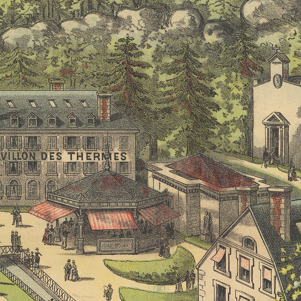 Chemins de Fer de l’Ouest. Etablissement thermal Bagnoles-de-l’Orne. La Suisse en Normandie by Imp. Camis introduces the storied spa town of Bagnoles-de-l’Orne at the height of the Belle Époque. Issued in 1892 for the Western Railway of France, this antique travel poster celebrates Normandy’s most celebrated thermal resort, long promoted as “La Suisse en Normandie” for its lake, fir-clad hills, and invigorating air. The imprint “Imp. Camis” identifies the Parisian lithographic house behind the work, whose refined printing gives the scene an elegant promotional sheen. In the artwork, cool blue tones meet deep greens and warm beige—an atmospheric combination that evokes forest, water, and pale stone architecture in one harmonious, enticing view.