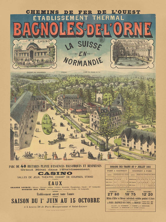 Bagnoles-de-l’Orne, nestled in the Orne department of Normandy, rose to fame in the 1800s as a therapeutic retreat. The town’s thermal establishment drew fashionable visitors for rest cures and promenades, accessible via the Chemins de Fer de l’Ouest—one of the great arteries that connected Paris to the coasts and countryside. The poster’s proud strapline “La Suisse en Normandie” neatly sums up the appeal: alpine freshness without leaving northern France, complete with lakeside leisure, pine-scented forests, and Belle Époque comforts.