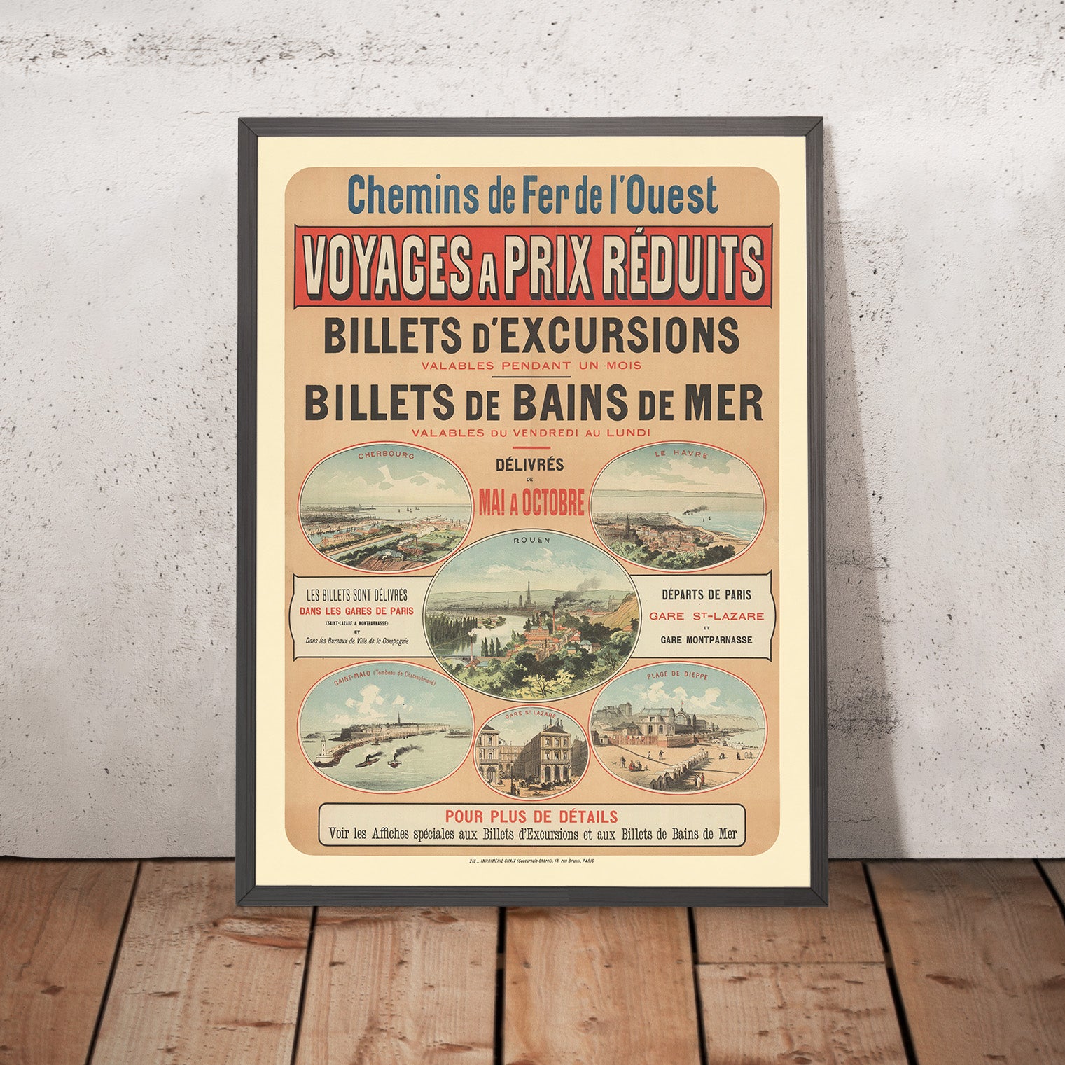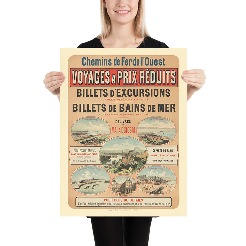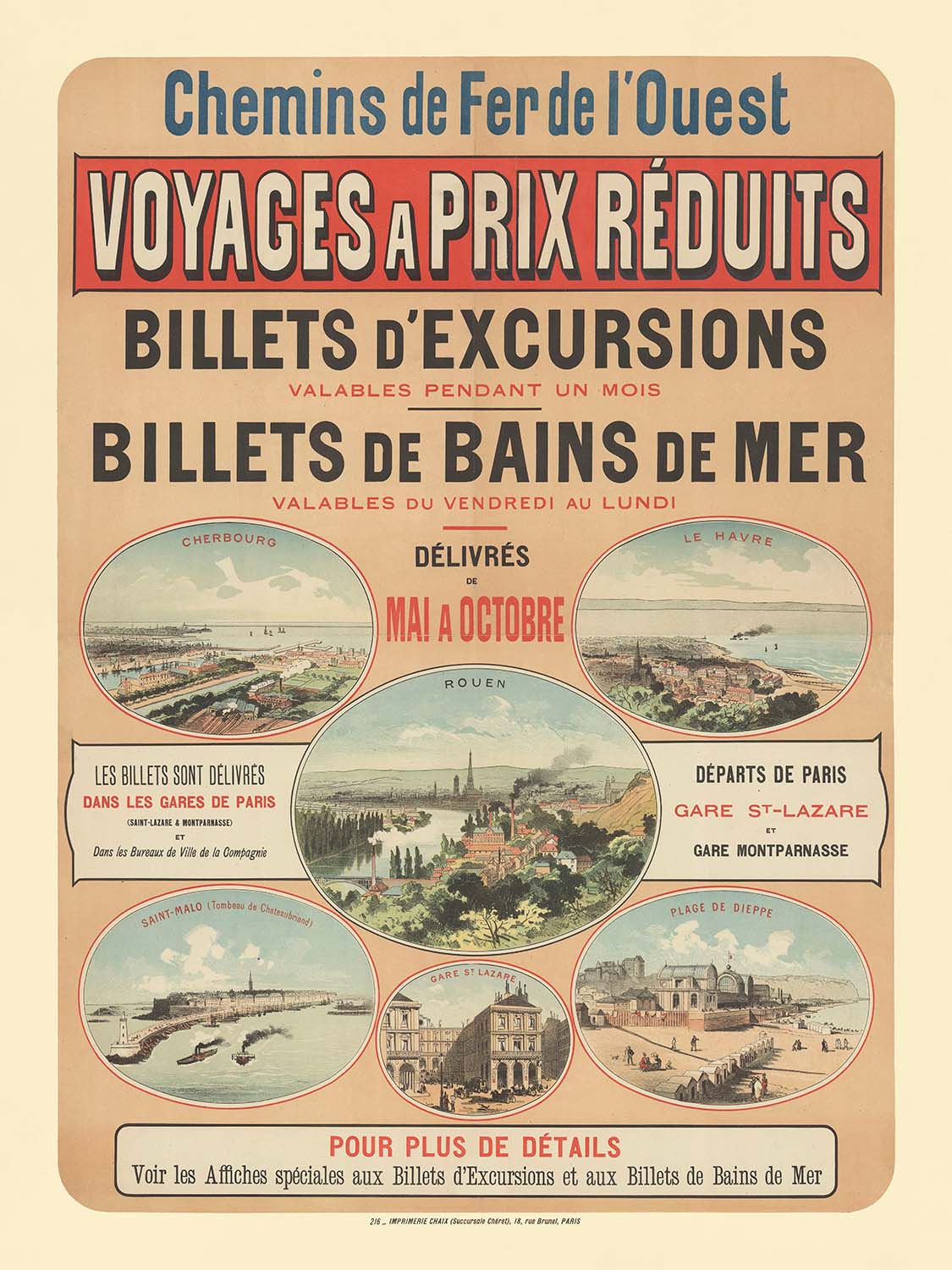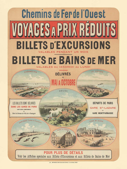 Chemins de Fer de l’Ouest. Voyages à prix réduits, Billets d’excursions, Billets de Bains de mer by Imp. Chaix (Imprimerie Chaix), 1885, is a quintessential French railway poster from the dawn of leisure travel. Printed in Paris, it advertises reduced-fare excursions and weekend “baths of the sea” tickets to the Channel coast, with departures from Paris’s Gare Saint‑Lazare and Gare Montparnasse. The design frames charming vignette views of destinations served by the Western Railway—clearly labeled scenes include Cherbourg, Le Havre, Rouen, Saint‑Malo (Tombeau de Chateaubriand), the Plage de Dieppe, and even a view of Gare St‑Lazare itself. In the central roundel, a plume of steam winds above Rouen on the Seine, while the Dieppe panel shows bathers and beach architecture against a pale blue sky.