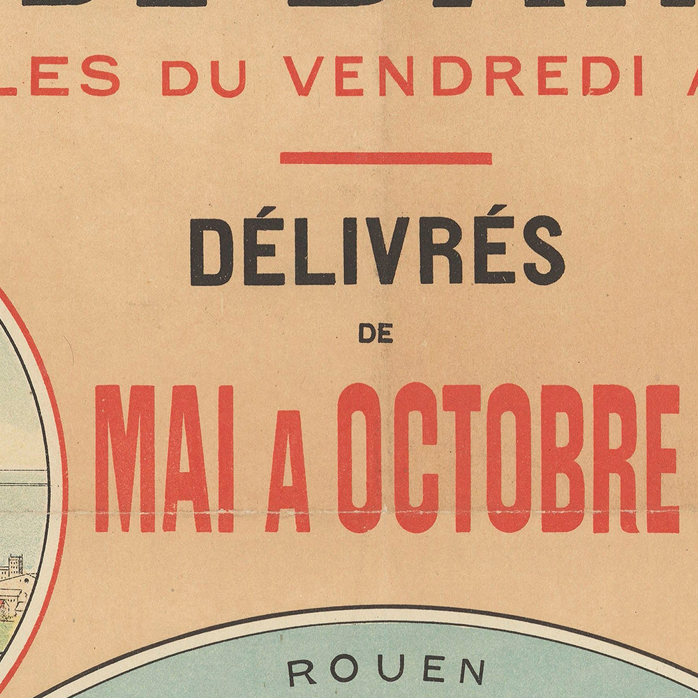 The subject matter captures a pivotal moment in French social history: the vogue for seaside “bains de mer” and the new freedom of weekend excursions by rail. On the poster you’ll spot practical details that made these trips possible—excursion tickets valid for one month, sea‑bathing tickets valid from Friday to Monday, issued May through October—paired with enticing views of Normandy and Brittany. For many, these towns and beaches remain beloved getaways from Paris.