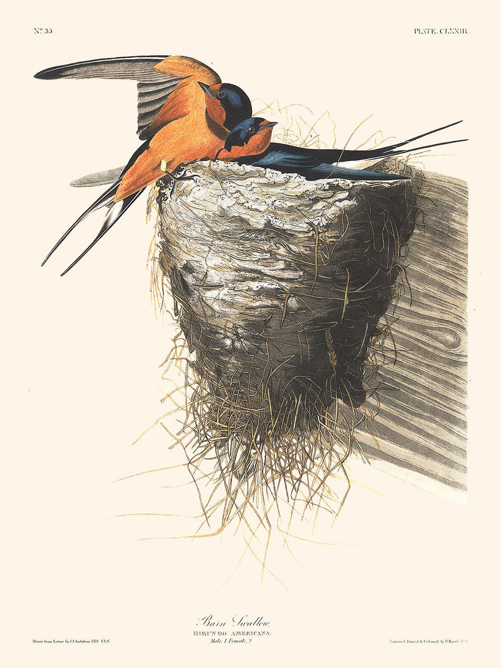 Barn Swallow (Plate 173) is an exquisite avian illustration from John James Audubon’s renowned series, Birds of America. This cherished depiction, first published in 1827, captures the fleeting elegance and spirited demeanor of the Barn Swallow with remarkable precision.