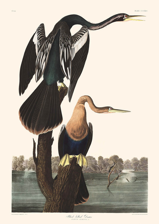 The Black-bellied Darter (Anhinga anhinga) is fascinating not only for its ecological significance but also for its striking aesthetic, as depicted in Audubon’s illustration. The rich colors and lifelike pose of the bird against a serene backdrop make this artwork a visual delight, demonstrating Audubon’s expertise in combining scientific accuracy with artistic beauty.