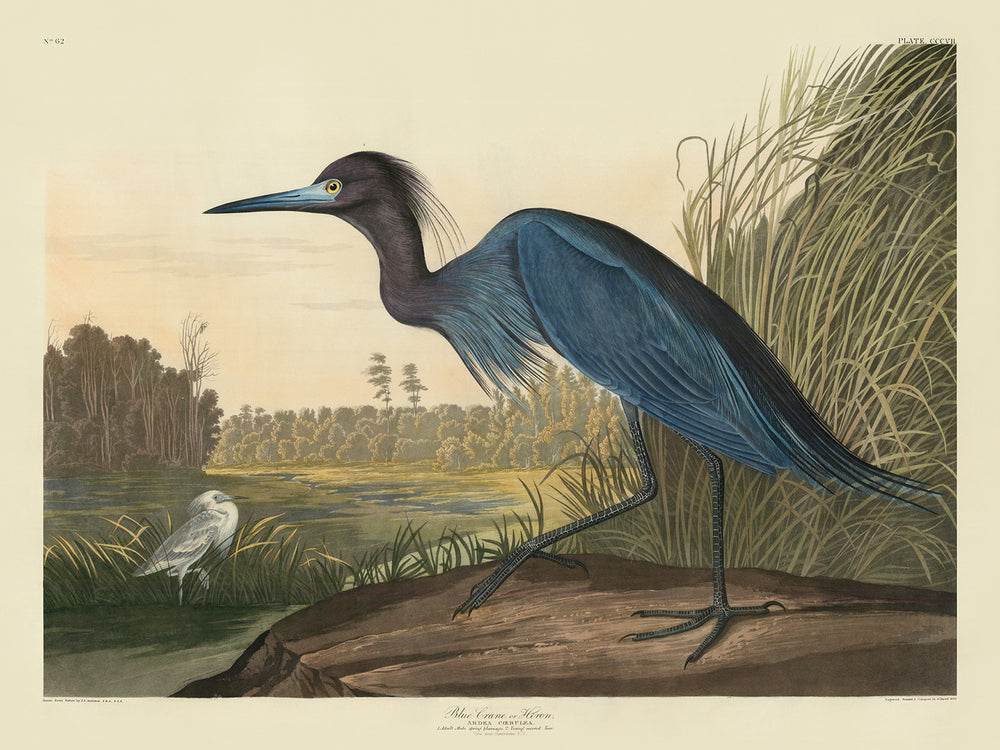 "Blue Crane or Heron, Ardea Coerulea... View near Charlestone S.C." by John James Audubon, first published in 1827, is an exceptional piece from the renowned "Birds of America" series. This exquisite Havell edition double elephant folio aquatint captures a mature Little Blue Heron male, whose slate-blue plumage stands out elegantly. The artwork masterfully positions this striking bird in the foreground, while a white juvenile Heron graces the grassy wetland backdrop near Charleston, South Carolina.