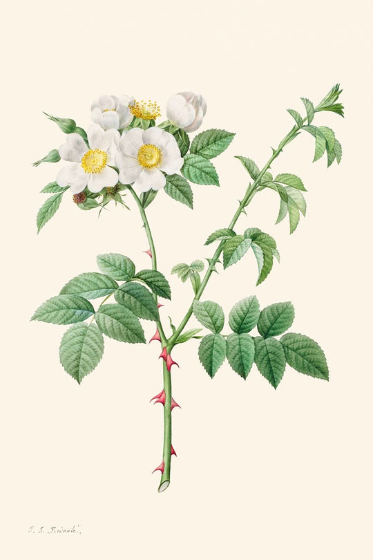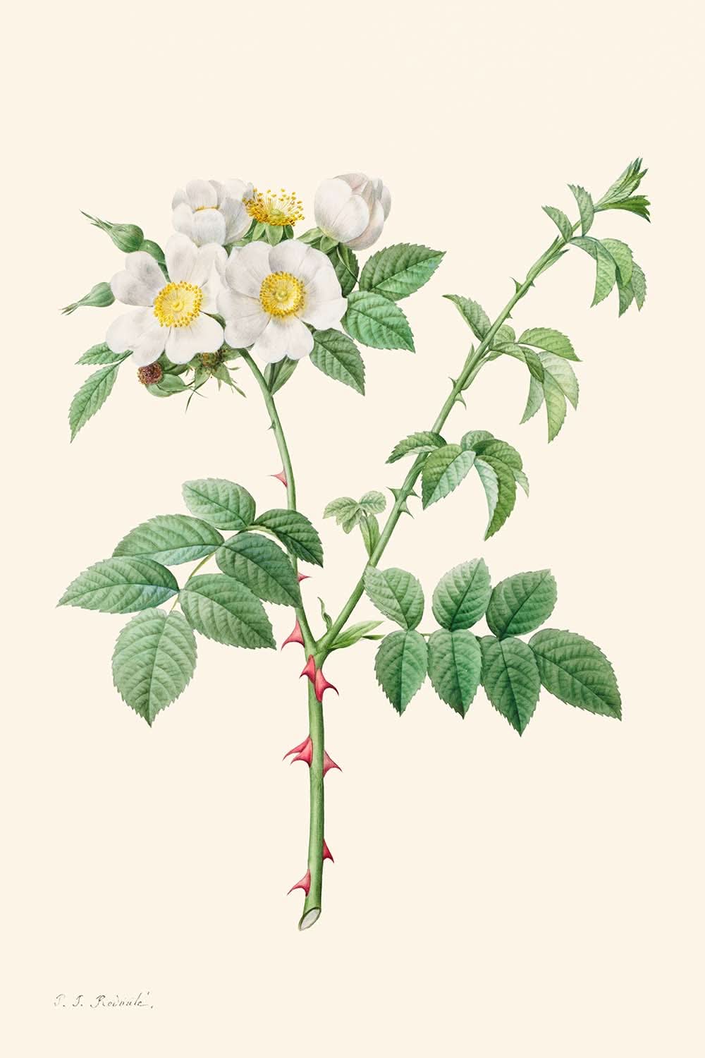 Brier Bush Rose or Dog Rose, first published in 1817, is a stunning botanical illustration crafted by the renowned artist Pierre-Joseph Redouté. Known as one of history's greatest botanical illustrators, Redouté dedicated much of his career to meticulously depicting the flora of Château de Malmaison, under the patronage of Josephine Bonaparte, Napoléon's esteemed wife.