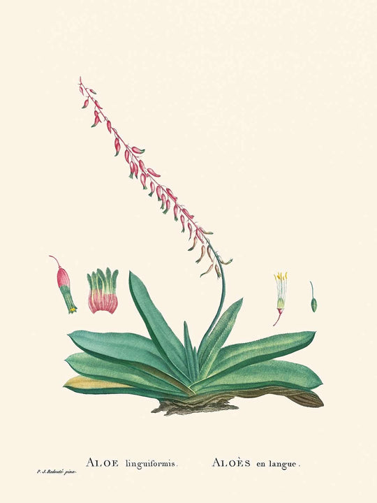 Cow's Tongue, originally titled Aloe Linguiformis, is a striking Victorian botanical illustration by the renowned artist Pierre-Joseph Redouté, first published in 1802. Redouté, often called the "Raphael of flowers," is celebrated for his precise and exquisite depictions of flora. His work became famous while he served as a painting tutor to Marie Antoinette and his artistry found continuing success at the behest of Josephine Bonaparte, whom he assisted by capturing the floral beauty of Château de Malmaison.