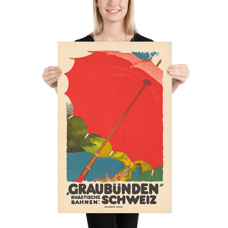 Graubünden, Rhätische Bahnen; Schweiz by Augusto Giacometti (1924) is a luminous Swiss travel poster celebrating the alpine canton of Graubünden and its famed Rhaetian Railway. Giacometti distills the joy of mountain holidays into a single striking motif: an enormous scarlet parasol arcs across the composition while its angled pole sweeps the eye down to a toy‑like village with a church spire, green hills and a blue lake. Bold black lettering anchors the scene, and the artist’s initials appear discretely at lower right—hallmarks of a golden age of poster design that invited travelers to the sunlit Engadin and beyond.