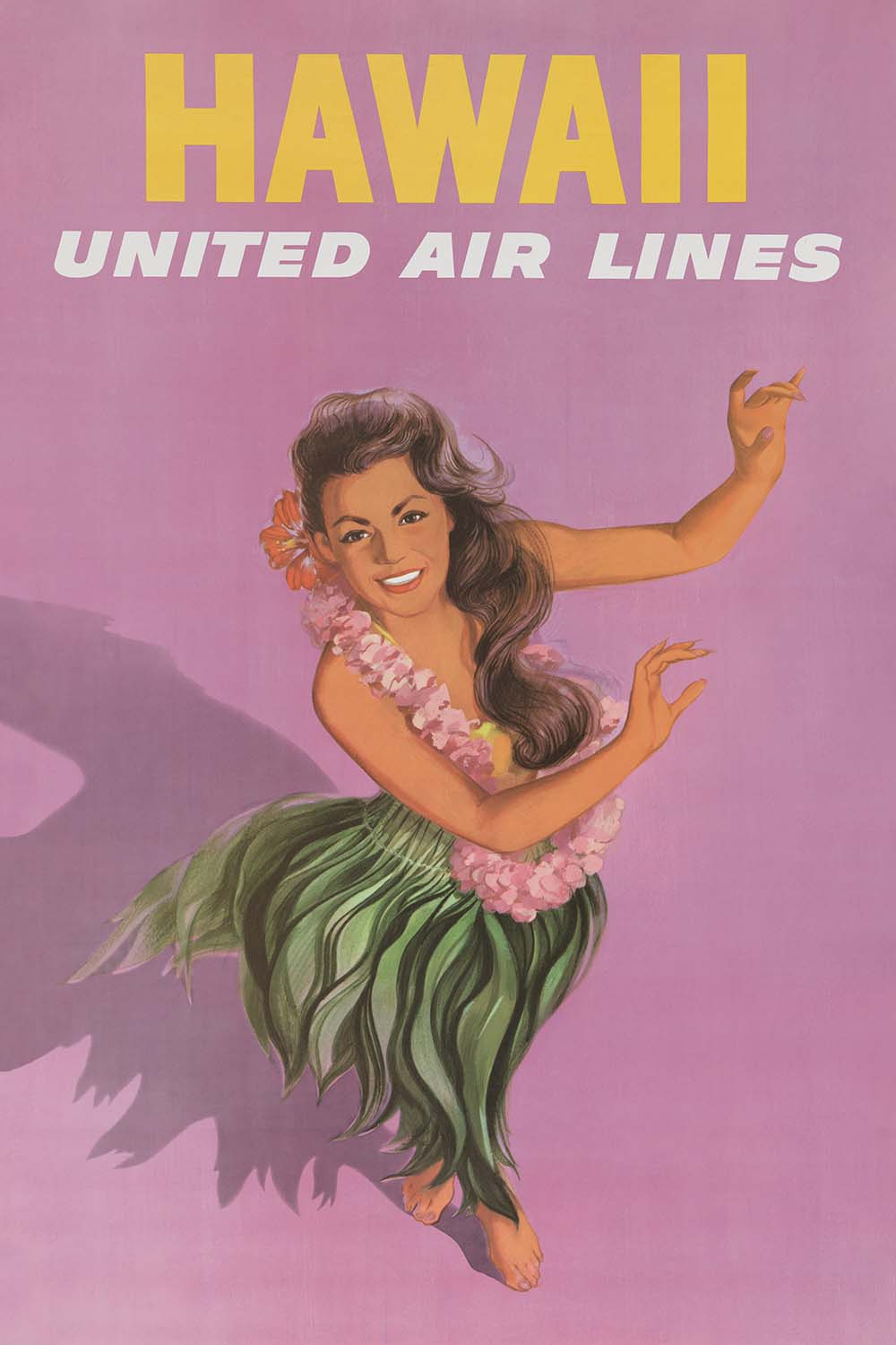 Hawaii United Air Lines (1960) is a classic mid-century travel poster created for United Air Lines by an anonymous in‑house illustrator. Evoking the optimism of the Jet Age just after Hawaii achieved statehood in 1959, it celebrates the islands through an iconic hula dancer poised against a soft pink field. The composition blends advertising savvy with fine-arts sensibility: smooth, sculptural curves, clean outlines, and tropical floral accents invite would‑be travelers into a sunlit, ocean‑breezed paradise.