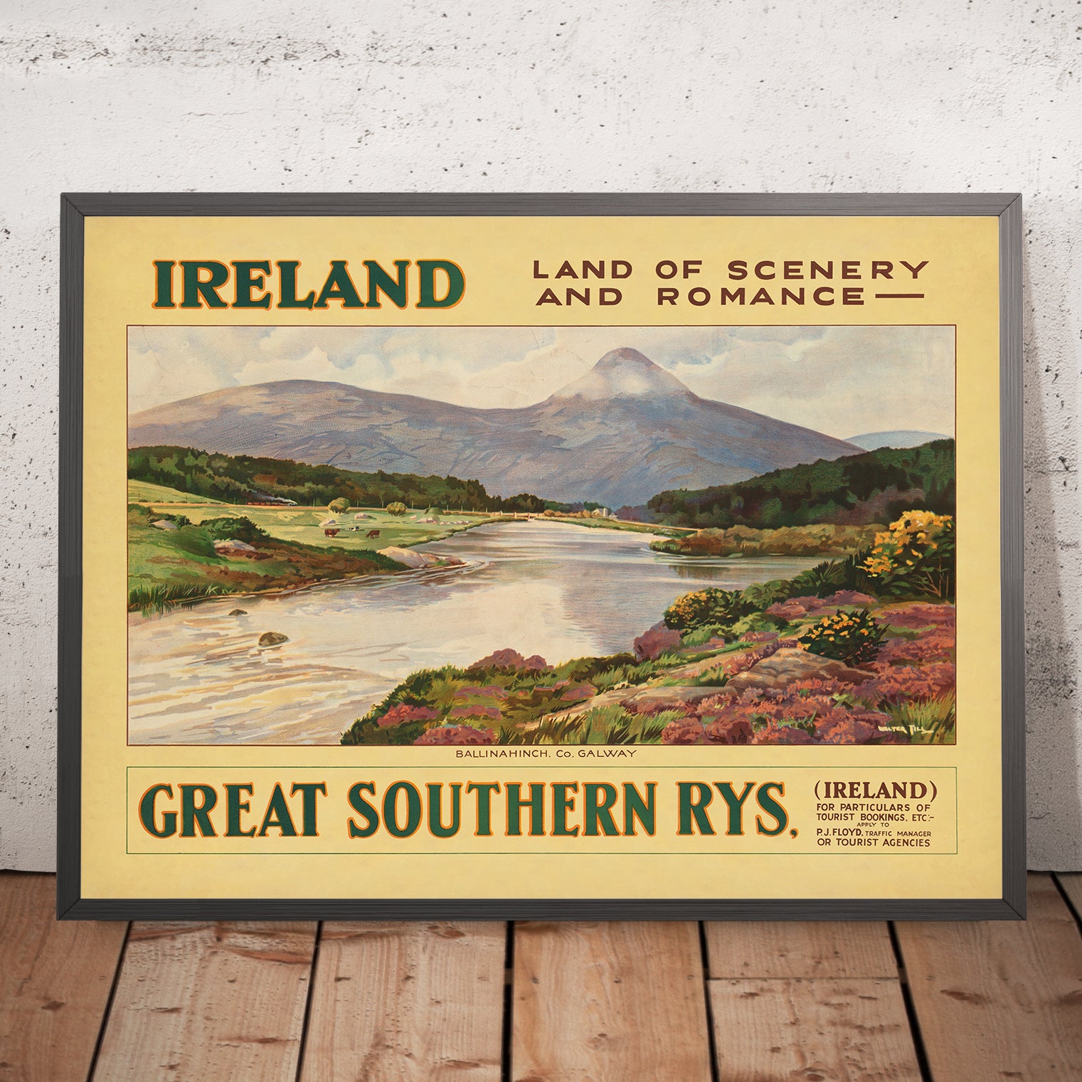 The subject is Ireland itself, portrayed as a place of serenity and romance. This was more than marketing—it was cultural storytelling that aligned with a broader post-Victorian enthusiasm for travel and the outdoors. As rail and steamship links expanded, posters like this welcomed visitors to explore Ireland’s lakes, rivers, and mountains, casting the countryside as timeless and restorative. For anyone with roots in Ireland, memories of a visit, or plans to go, the image evokes the hush of a riverside walk and the glow of late afternoon light on heathered slopes.