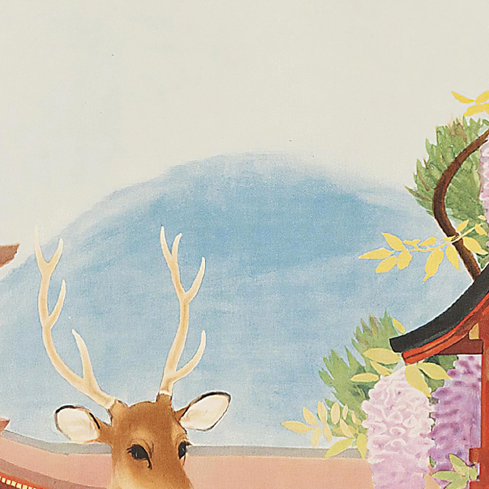 Why the subject matters: the composition likely nods to celebrated temple districts where five‑storied pagodas rise above gardens, and to the culturally significant deer associated with ancient shrines. The deer—sika deer (Cervus nippon)—are emblems of good fortune and, in some traditions, messengers of the gods. The cascades of wisteria, echoing Japan’s beloved springtime “fuji” (Wisteria floribunda), add a lyrical seasonal cue that resonates with travelers who’ve experienced temple gardens in bloom.