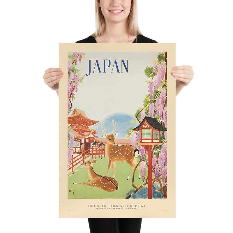 Titled simply “JAPAN” and first published in 1934, this anonymous Shōwa‑era travel poster distills the quiet poetry of Nihonga—traditional Japanese painting—into a modern promotional image. Designed at a time when Japan balanced rapid modernization with pride in its cultural heritage, the poster invites the viewer into a serene landscape: wisteria blooms in soft pinks cascading over lush green foliage, a warm red pagoda anchoring the scene, and graceful deer symbolizing harmony with nature. The bold wordmark “JAPAN” underscores its purpose as an invitation to explore a country of timeless beauty.