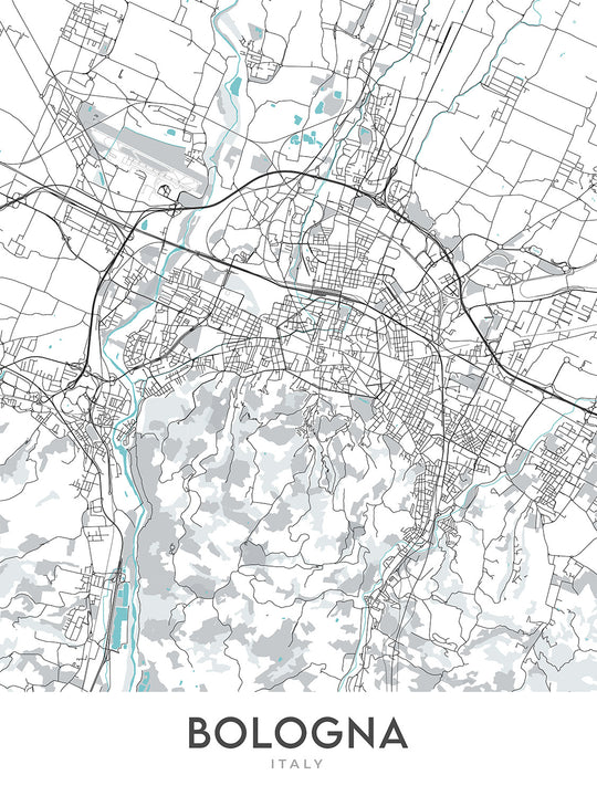 This map of Bologna is a modern city map, featuring a detailed street layout without labels. The map covers a large area of the city, including many notable neighborhoods and landmarks. The city is known for its beautiful architecture, rich history, and vibrant culture, all of which are reflected in this map.