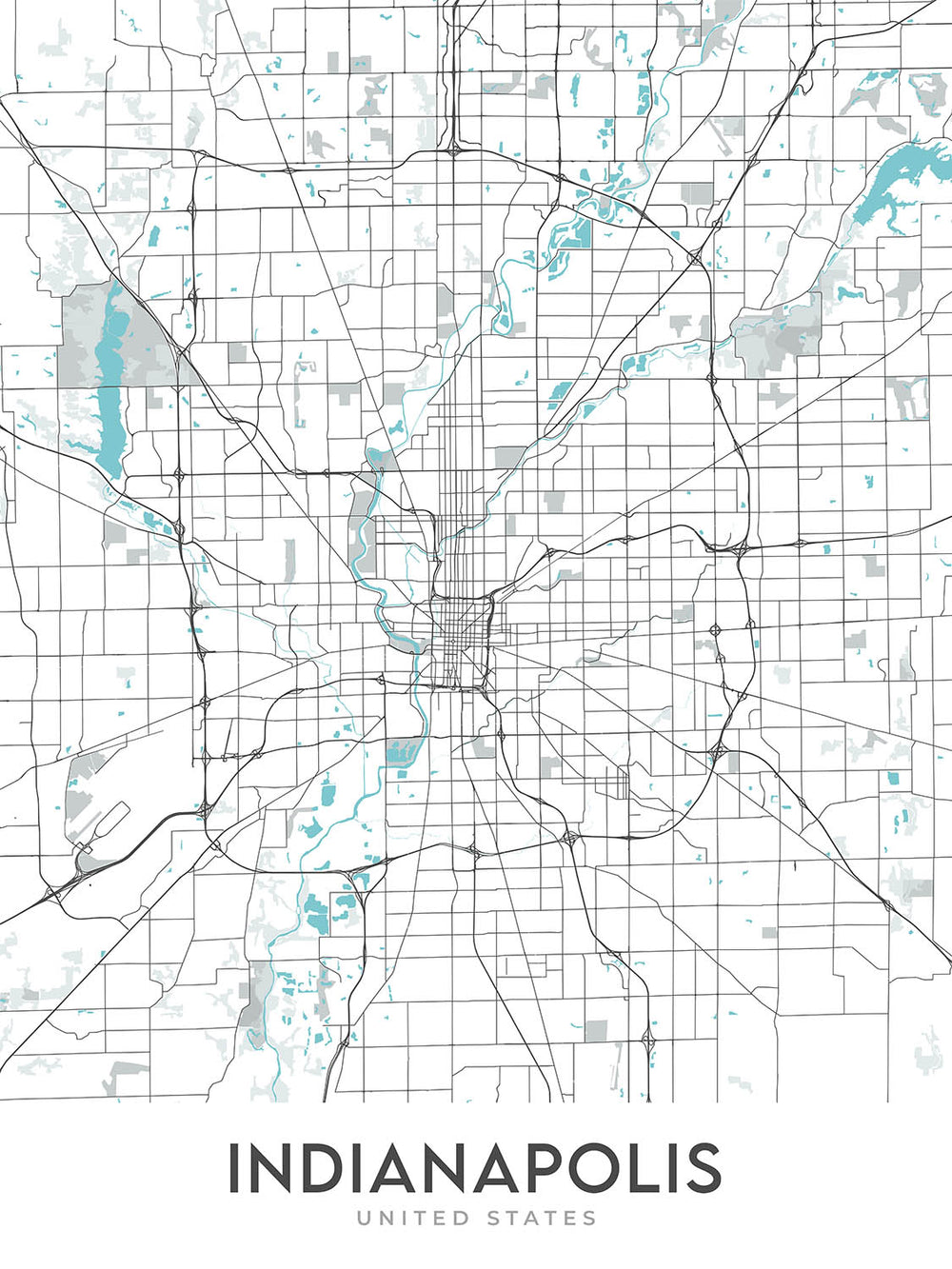 This map of Indianapolis, Indiana, is a modern, detailed street map without labels. The map focuses on the city of Indianapolis and its surrounding areas, providing an accurate and visually appealing representation of the city's layout. The map covers a rectangular area that extends approximately 25 miles from north to south and 21 miles from east to west, encompassing various neighborhoods, towns, major roads, and landmarks.