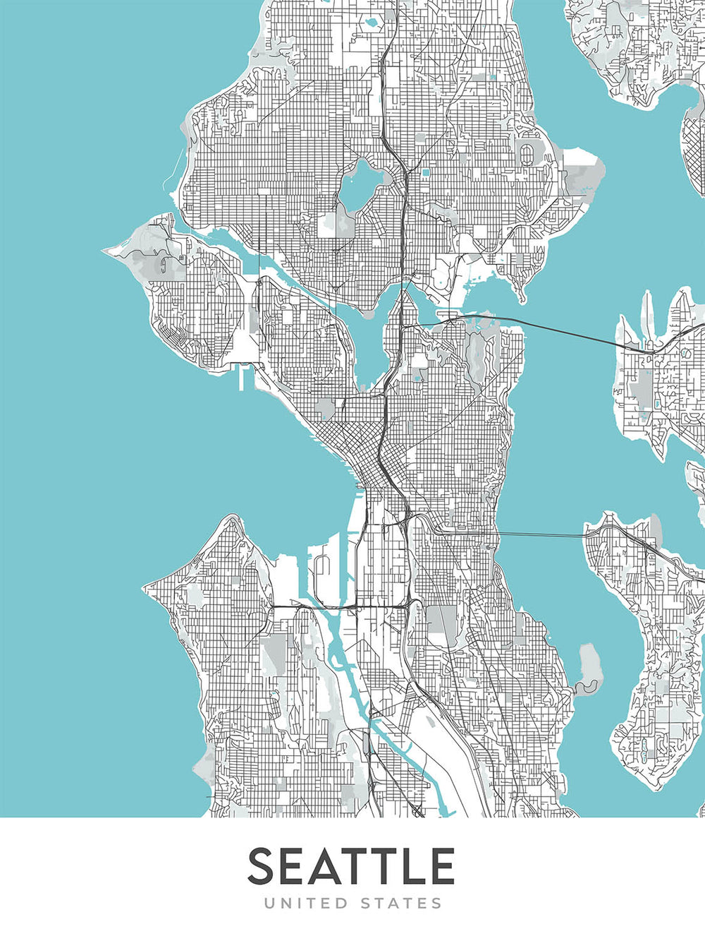 Modern City Map of Seattle, WA: Capitol Hill, Queen Anne, Belltown, Pike Place Market, Space Needle