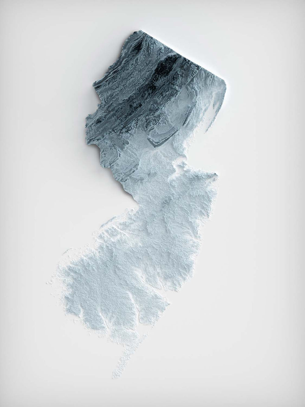 New Jersey’s distinctive peninsulas, bays, and inlets—from Sandy Hook to Cape May—are cleanly defined, showing off the state’s intricate shoreline and marshlands. The interplay of shadow and high points artfully showcases the variety of environments: from bustling northwestern ridges, across fertile central valleys, to the tranquil southern stretches that lead to endless beaches and barrier islands.