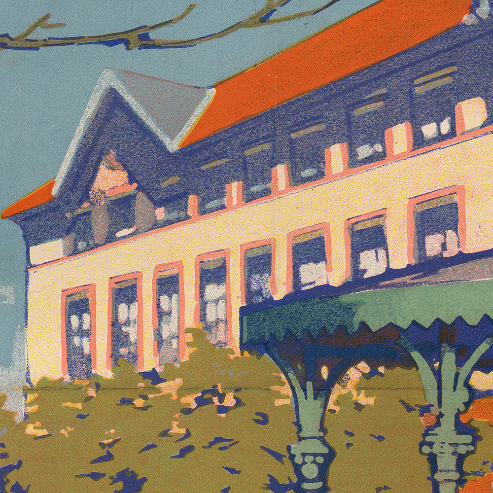 Design notes: the palette is led by cooling blues and greens, set off by the casino’s striking orange-red rooftops and terracotta accents. Deep teal shadows under the bandstand contrast with pale sky gradients, while clusters of strolling figures and trimmed trees create a rhythm of movement across the square. The composition’s natural frame—the sweeping tree trunk and branches to the left—guides the eye into the heart of the resort, making this artwork a compelling focal point for an entryway, living room, or hospitality space. If you have fond memories of Alsace or simply love refined European poster design, this print brings that restful, sunlit ambience home.