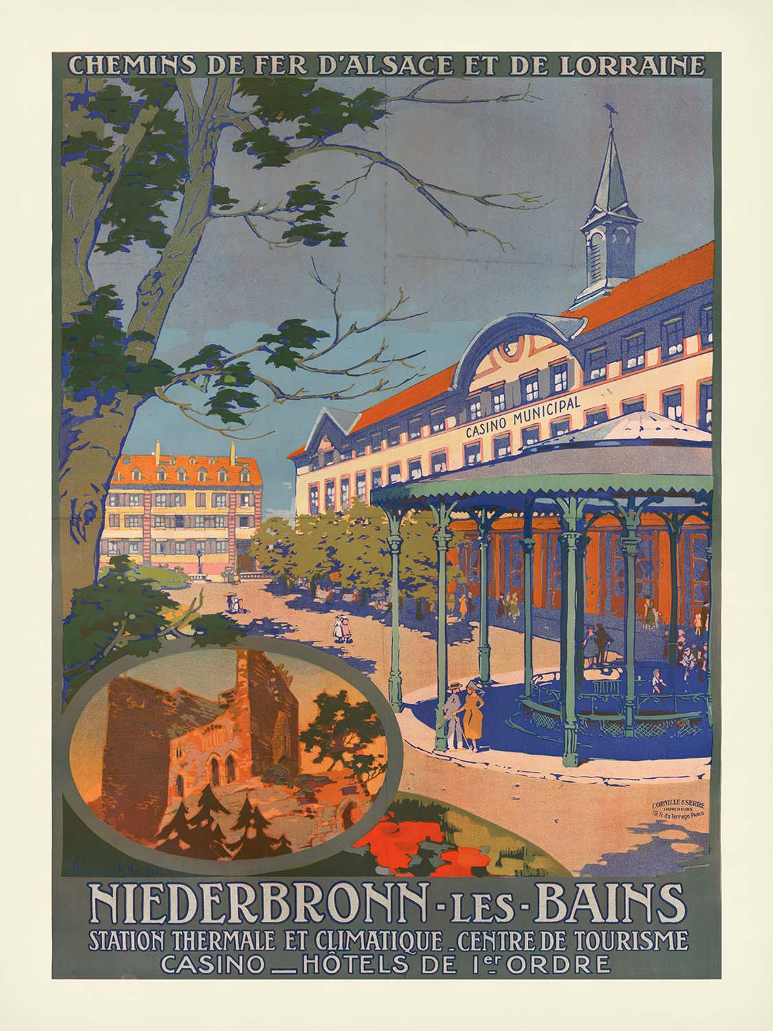 About the place: Niederbronn-les-Bains has been celebrated for centuries for its mineral springs and fresh mountain air, drawing visitors to the Northern Vosges for health cures and recreation. The Chemins de fer d’Alsace et de Lorraine—whose name crowns the poster—connected spa towns and picturesque valleys, making weekend escapes from larger cities effortless. The inset vignette at lower left, featuring a warm-toned medieval ruin amid firs, hints at the nearby castles and walking trails that add to the town’s appeal.