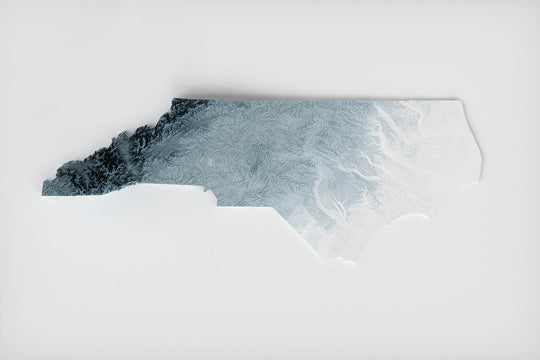Bring North Carolina to life with a map that feels as dynamic as the landscape itself. The state stretches from the rugged summits and deep hollows of the Appalachian Mountains in the west—where steep ridgelines and high peaks catch the light and cast dramatic shadows—to the broad, rolling Piedmont in the heart of the state. Here, you’ll see gentle undulations, highlighted by a play of light that brings out the subtle hills and river valleys winding through the region.