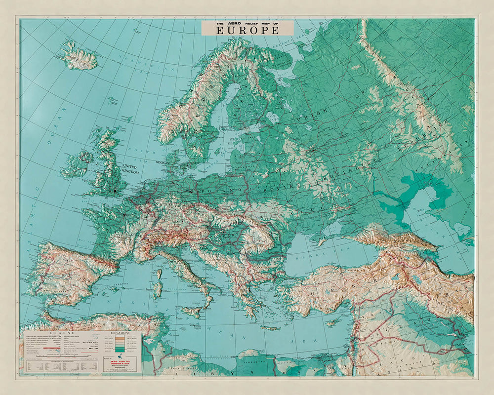 The Aero Service Corporation, celebrated for its expertise in aerial surveying and photogrammetry, imbued this map with a level of detail and accuracy that was exceptional for its time. The map’s relief design, meticulously molded to highlight Europe’s varied topography, was a direct result of cutting-edge photogrammetric techniques. Its creation during the post-World War II era—an age marked by geopolitical tension and a renewed interest in geographic knowledge—reflects the strategic and academic importance of understanding the continent’s terrain.
