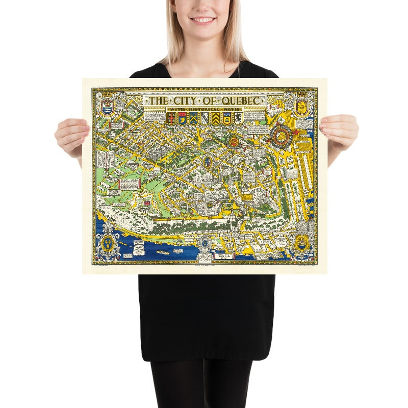 Rare Old Pictorial Map of Quebec City by Maw 1932: Citadel, Old Quebec, St. Lawrence, Abraham 1759, CNR