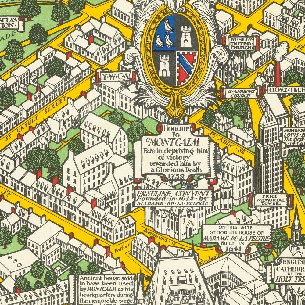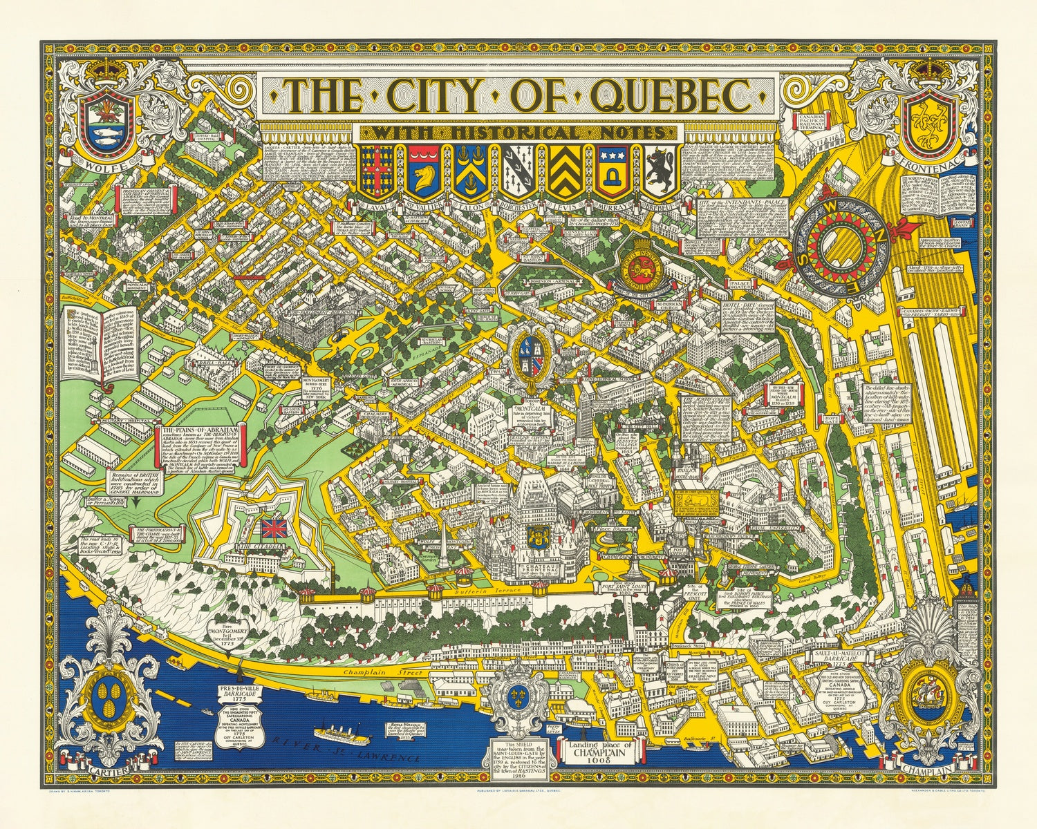 Samuel Herbert Maw’s The City of Quebec with Historical Notes (1932) is a tour de force of the pictorial cartographic revival, marrying scholarly narrative with painterly finesse. From a luminous bird’s‑eye perspective, Quebec City unfurls in miniature—streets, neighborhoods, and landmark facades rendered with jewel‑box precision. Elaborate scrollwork frames the scene, while allegorical figures and decorative floral borders—adorned with provincial emblems of Canada—announce a story as ceremonial as it is informative. A finely modeled compass rose anchors orientation, and bold color bands carve the city into distinct districts and terrains. Throughout, cartouches honor Wolfe, Frontenac, Cartier, and Champlain, and inset texts recount formative episodes, transforming the map from a mere guide into a richly layered historical tableau.