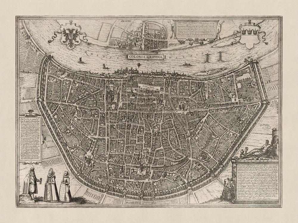 In essence, "Colonia Agrippina" by Georg Braun is more than a map; it is a luxury artifact that encapsulates the spirit of Cologne in the 16th century. Its detailed cityscape, rich historical narratives, and artistic flair make it a prized possession for any collector or enthusiast of history and cartography. This map invites viewers to traverse the cobblestone streets of Cologne, exploring its neighborhoods, landmarks, and the flowing Rhine, all from the comfort of their own home. A true masterpiece of the Late Renaissance, it stands as a testament to the fusion of artistic grandeur and empirical observation, immortalizing Cologne's architectural, political, and spiritual fabric during a significant epoch of its history.