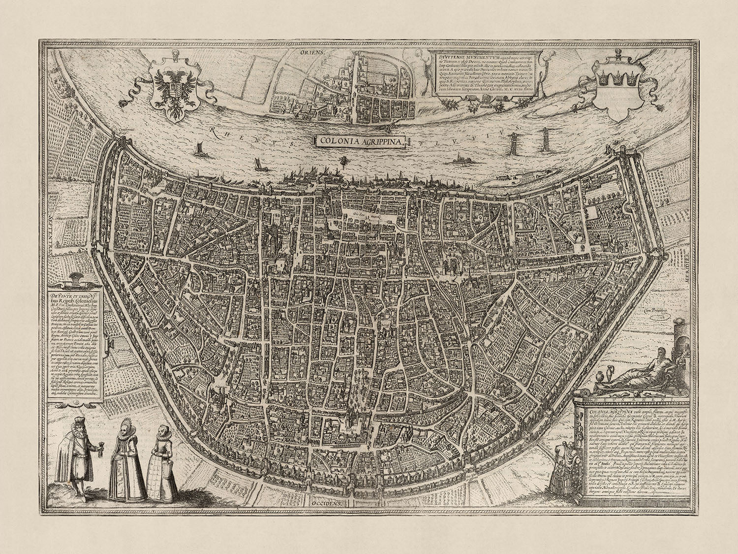 Braun's commentary and the narrative inscribed within the cartouches enrich the map with layers of historical context. From the strategic significance of Cologne's bridge to the religious import of the relics of the Magi, each cartouche weaves a tale of political, ecclesiastical, and cultural power. The map not only portrays Cologne as a center of trade and academia but also as a beacon of governance within the Hanseatic League and the Holy Roman Empire. This confluence of history and artistry renders the map not just a geographical representation but a vibrant tapestry of Cologne's illustrious past.