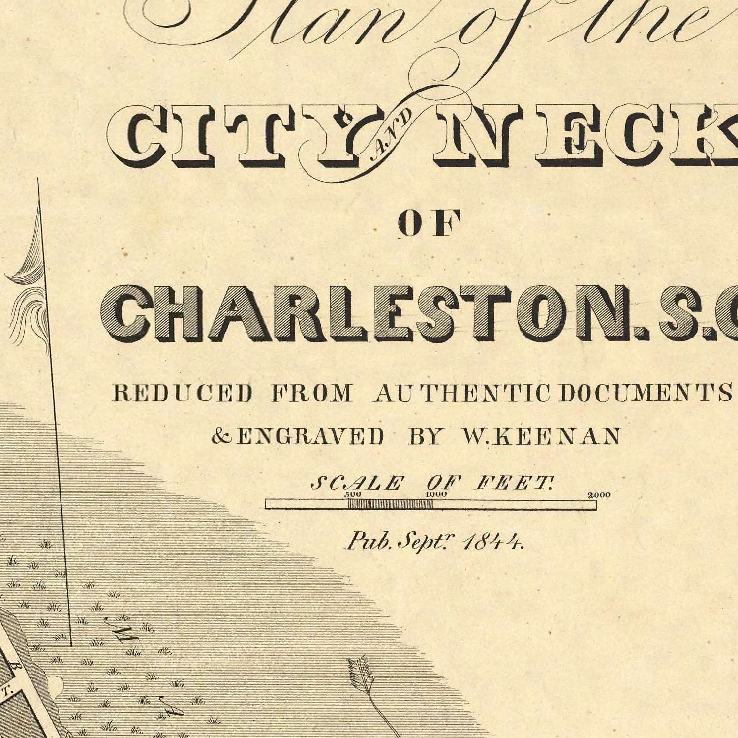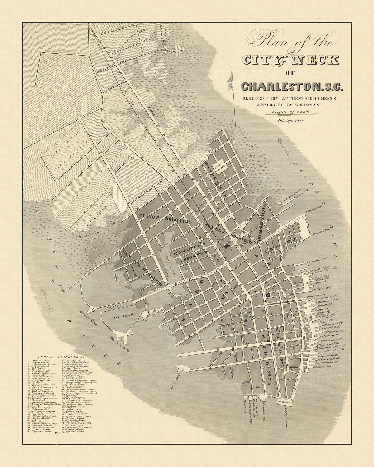 Plan of the City Neck of Charleston, S.C., issued in September 1844, presents a scarce and incisive portrait of the peninsula poised between the Ashley and Cooper Rivers at the height of the antebellum era. The plan’s measured geometry clarifies the city’s growth along a coastal corridor that had long balanced mercantile ambition with tidal realities. It is a notably rich city map: streets, wharves, and civic spaces are identified with uncommon precision, while a comprehensive key enumerates institutions central to Charleston’s identity. At a moment when urban reform and modernization were accelerating, the plan captures a city articulating its neighborhoods and public realm with confidence, and it does so with the poise and craftsmanship of William Keenan’s hand.