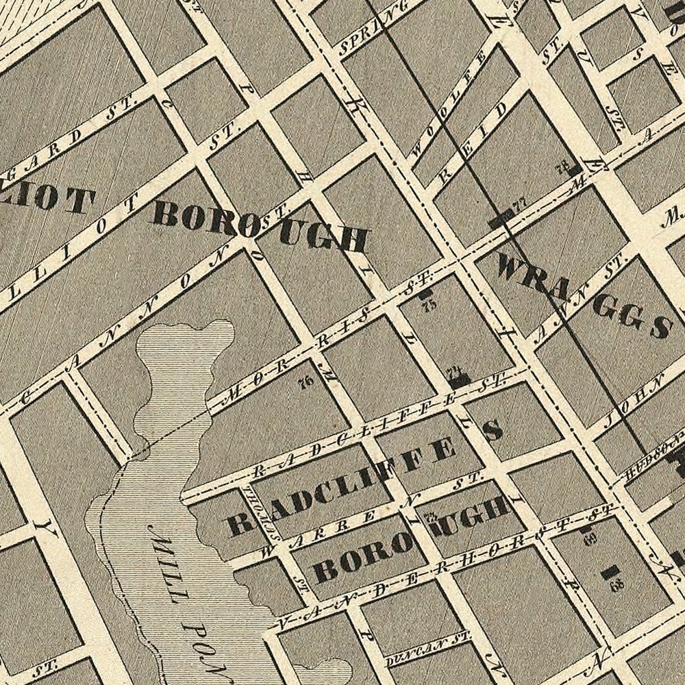 Equally revealing are the eight fire wells plotted across the grid—purposeful punctuation marks in a city repeatedly tested by flames. In the wake of the devastating 1838 fire, Charleston invested in public safety, and this plan memorializes that resolve in cartographic form. The placement of wells near dense commercial corridors and historic parishes suggests municipal forethought, while the concentration around Anson Street and the East Bay underscores areas of heightened risk. Seen together with the generous street widths along Meeting and King, the wells attest to a program of resilience: an early, infrastructural choreography devised to slow conflagrations, supply water, and protect the churches, halls, and warehouses enumerated in the map’s meticulous key.