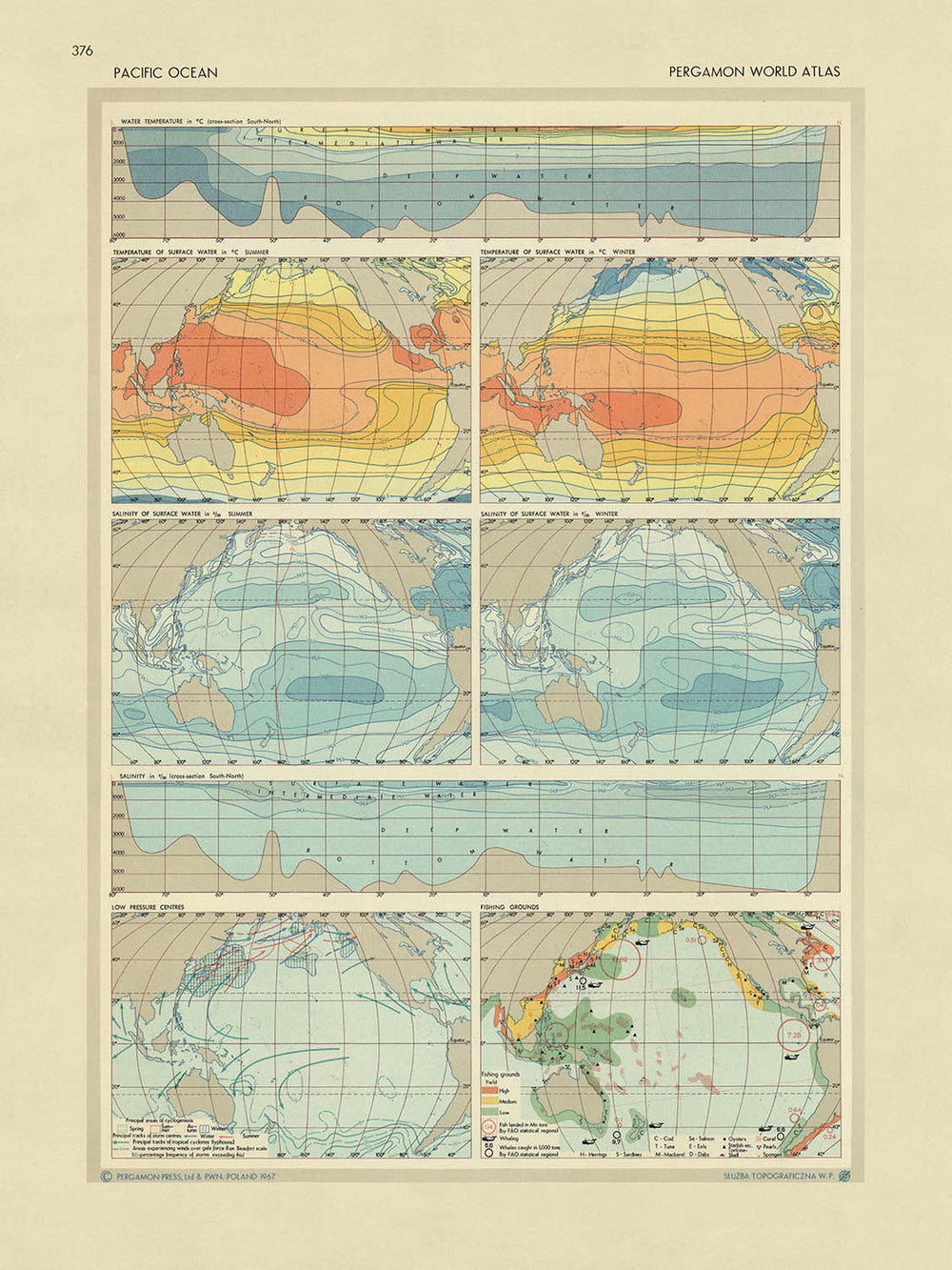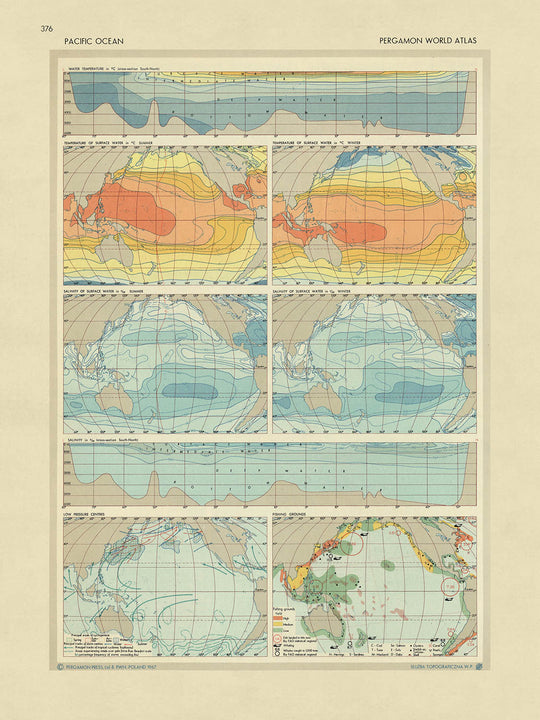 - Eight maps and graphics showing Pacific Ocean attributes: temperature cross-section, salinity cross-section, seasonal salinity and temperatures, low pressure areas, and fisheries.