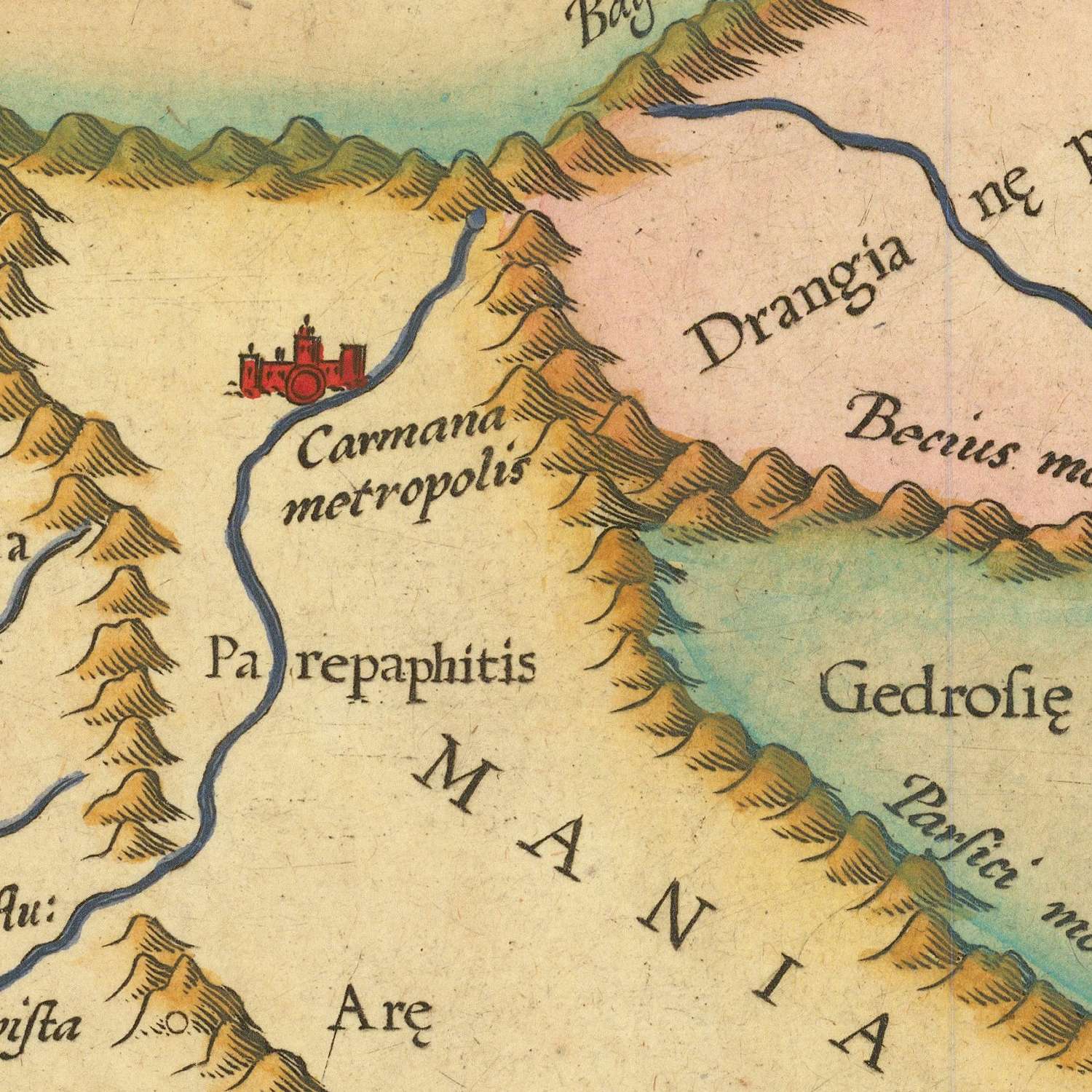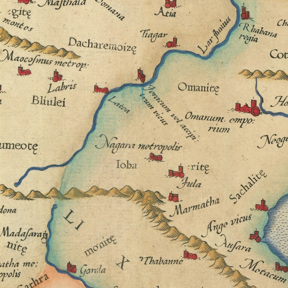 Mercator’s achievement lies in the way he refines a Ptolemaic framework without abandoning it. Working within the familiar trapezoidal projection of the classical tradition, he calibrates coastlines, river courses, and inter-city distances to align more closely with late Renaissance intelligence from merchants, diplomats, and sailors. The result is a learned palimpsest where Arabia Felix, Arabia Deserta, and Persis coexist with emergent understandings of the Red Sea’s narrows and the Persian Gulf’s curvature. In doing so, Mercator elevates Ptolemy from venerable authority to living interlocutor, demonstrating how ancient schema could be disciplined and improved by contemporary observation.