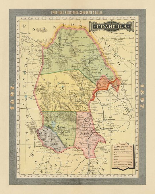 Step into the rich tapestry of late 19th-century Mexico with "Coahuila," the original title of this masterful 1897 map crafted by the celebrated cartographer Antonio García y Cubas. Commissioned during a transformative era in Mexican history, this map stands as both a geographical record and a cultural artifact, reflecting the ambitions of a nation intent on defining its identity and territorial integrity. García y Cubas’s meticulous attention to detail is immediately evident, from the elegant silver border that frames the map to the finely rendered symbols that distinguish state capitals, district head towns, villages, haciendas, and ranchos. Every inch of this cartographic treasure invites the viewer to explore Coahuila as it stood at the threshold of modernity.