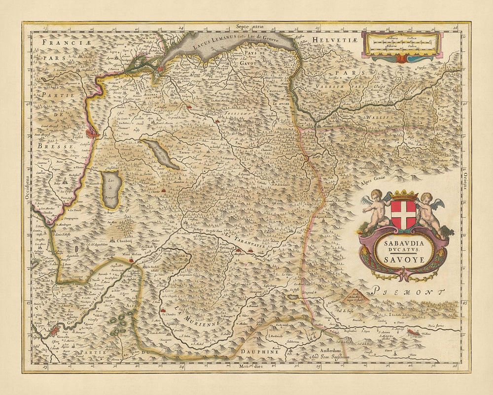 The 'Sabaudia Ducatus: Savoye' map is not just a cartographic masterpiece, but also a historical document. It features decorative cartouches and the coat of arms, reflecting the political significance of the Duchy of Savoy. The map's hand-colored outline further enhances its aesthetic appeal, making it a perfect blend of art and history. This piece is a splendid addition to any collection, offering a glimpse into the past while serving as a conversation starter about the rich history and geography of the Duchy of Savoy.