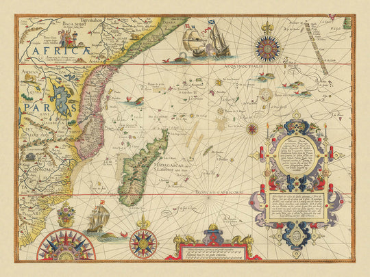Beyond its artistry, the map is a document of cultural exchange and myth. It portrays not only the well-trafficked coasts but also the imagined interiors of Africa, peopled with elephants, lions, and symbols of wealth and wonder. The depiction of Madagascar (then known as S. Lorenzo), the Maldives, and even the southern tip of India and Ceylon, underscores the interconnectedness of distant worlds and the ambitions of empires. Each feature—be it a bustling port or a fabled river—speaks to the era’s blend of empirical observation and imaginative geography.