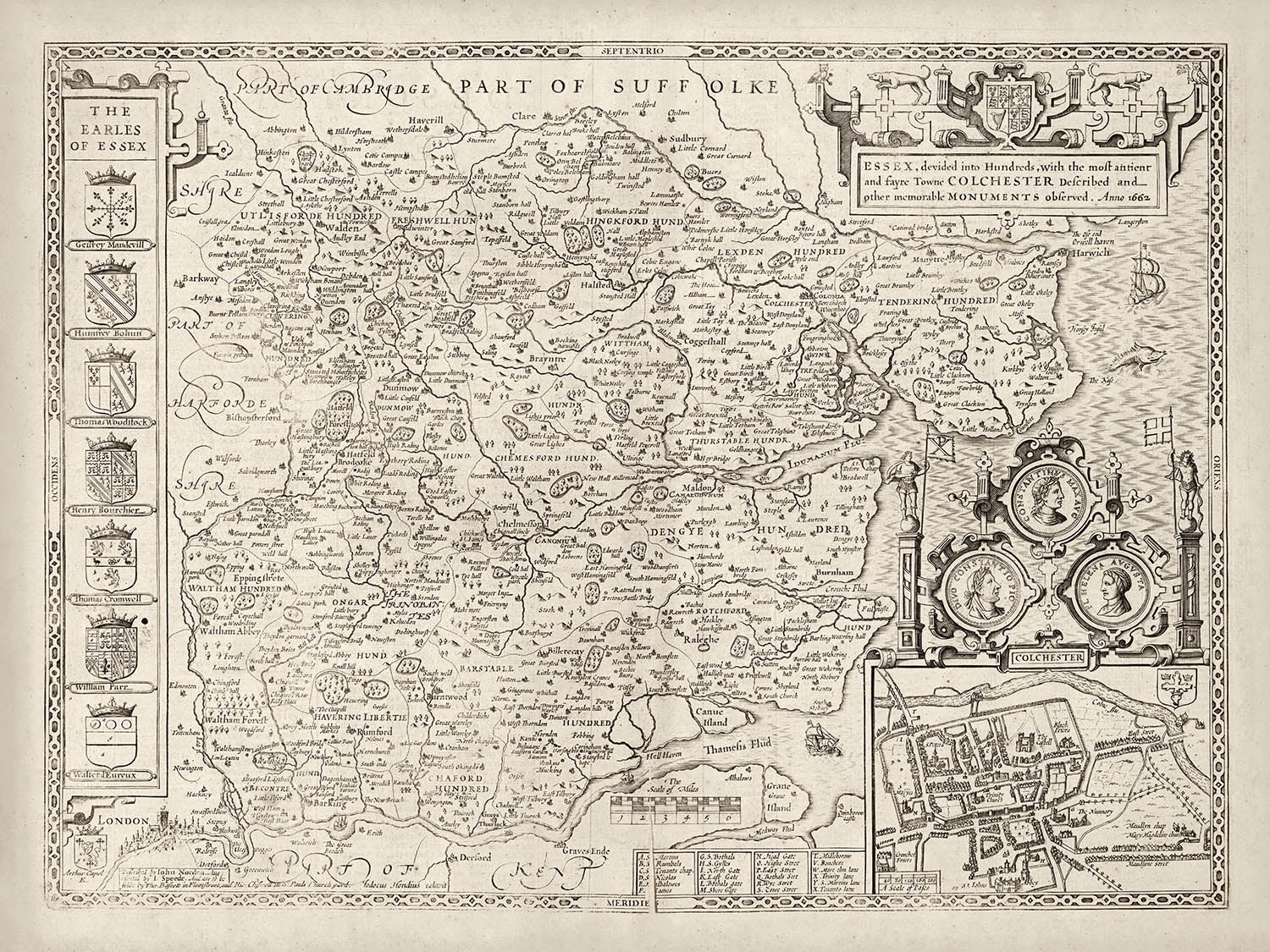 Many of the towns, villages and cities in Essex are already visible in this ancient map, such as Colchester, Chelmsford and Braintree. There's a detailed engraving of Colchester in the bottom right (the capital of the county) and some coats of arms on the left side of the map.