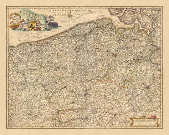 This map provides a unique opportunity to explore the rich tapestry of Flanders as it was in the late 17th century. It serves as a testament to the region's historical importance and the intricate cartographic skills of Nicolaes Visscher II. Whether you're a history enthusiast, a lover of maps, or simply someone who appreciates the beauty of old-world craftsmanship, this map of Flanders is sure to be a captivating addition to your collection.