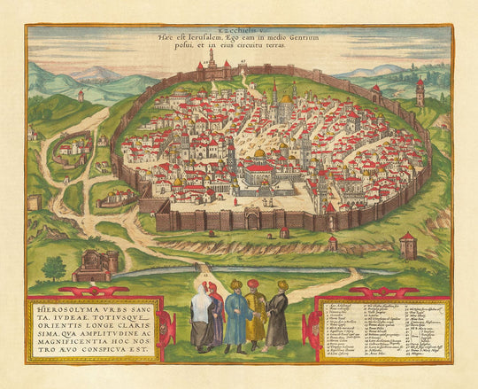 Old Map of Jerusalem, 1582 by Georg Braun: Jewish & Islam Old City, Temple Mount, City Walls, Tower of David, Jaffa Gate
