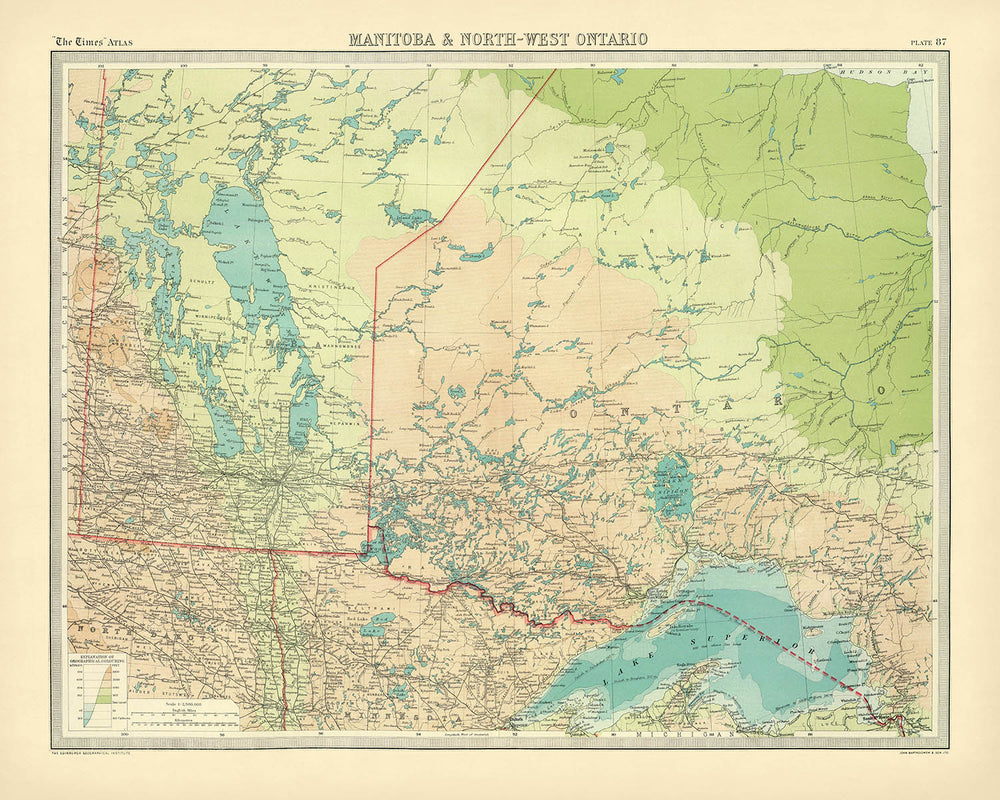 Bartholomew’s artistry is immediately evident in the map’s meticulous depiction of relief and terrain. Employing hypsometric tints and precise spot heights, he brings the varied landscapes of Manitoba and northwestern Ontario to life. The gentle gradients of color not only capture the subtle undulations of the Canadian Shield and prairie lands but also offer a tactile sense of the region’s topography. Bathymetric tints further enrich the visual experience, revealing the hidden contours and depths of the region’s great lakes and waterways, including the iconic Lake Winnipeg, Lake Manitoba, and Lake Winnipegosis.