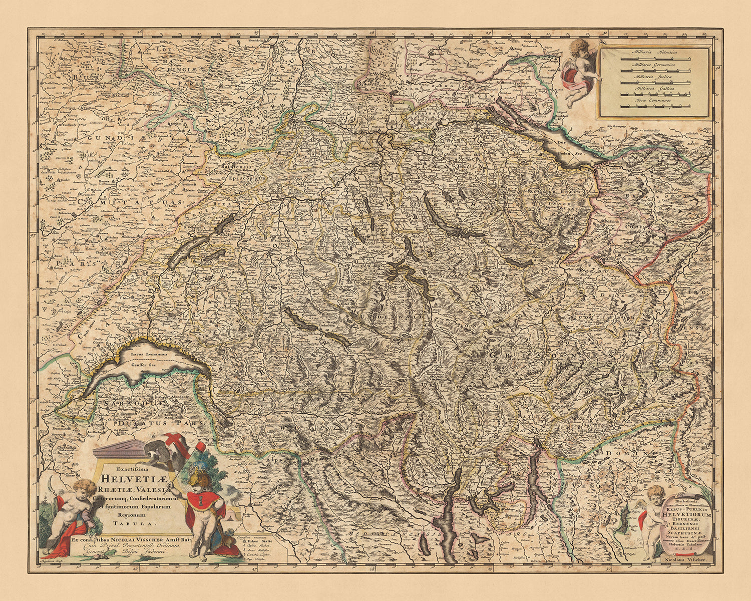 Immerse yourself in the rich history of Switzerland with this stunning map, crafted in 1690 by the renowned cartographer Nicolaes Visscher II. This map, known as 'Exactissima Helvetiae, Rhaetiae, Valesiae caeterorumque Confoederatorum ut et finitimorum populorum regionum tabula', is a detailed depiction of Switzerland and its surrounding regions during a time of significant political and cultural evolution.