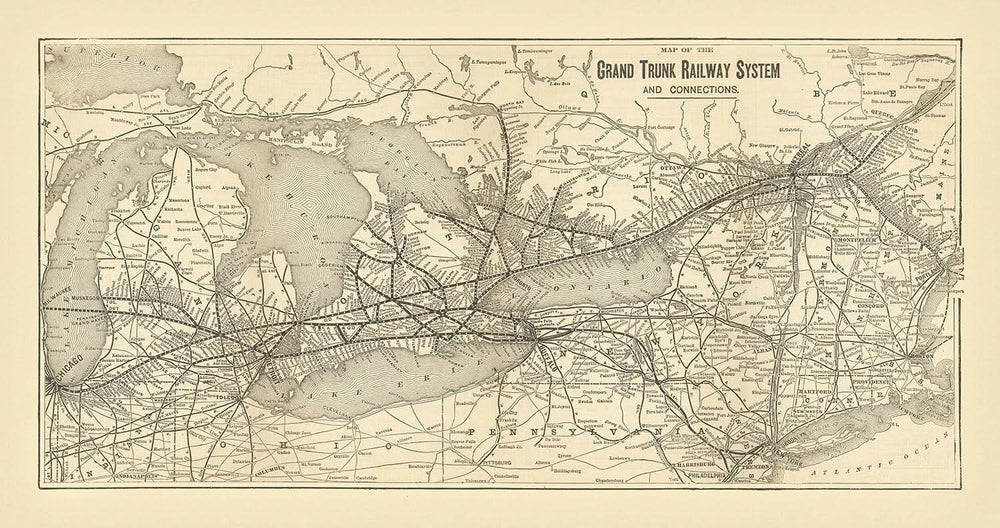 Historically, the Grand Trunk Railway was chartered in 1852, with the ambitious goal of connecting Montreal and Toronto. By the 1880s and 1890s, it had reached its zenith, expanding into the United States and reducing Canada's reliance on British maritime trade. This map reflects the railway's peak, showcasing its extensive reach and the critical role it played in fostering economic independence and growth in Canada.