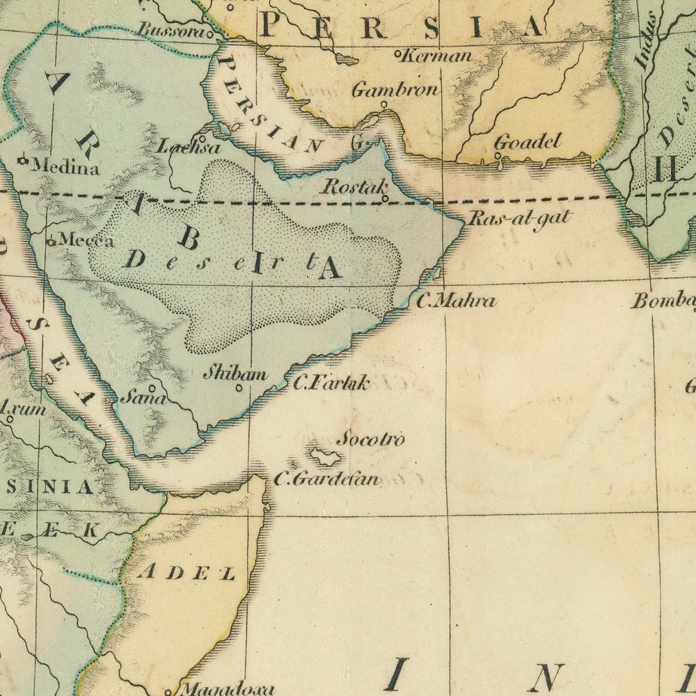 To the east, Persia appears as a consolidated power under the emergent Qajar dynasty, its boundaries articulated by the Zagros, the Caspian littoral, and the Persian Gulf. Wilkinson’s labels hint at caravan corridors that continued the Silk Road’s commercial logic into the modern era. The Arabian Peninsula is presented with the Hejaz foregrounded, Makkah marked as the spiritual axis of pilgrimage routes radiating across three continents. In the interior, the map reflects a peninsula on the rise, where reformist currents and new alliances challenged the Ottoman-appointed sharifs—an early sign of the political and religious realignments that would reshape Arabia in the decades to follow. Together, these portrayals read as both atlas and chronicle.