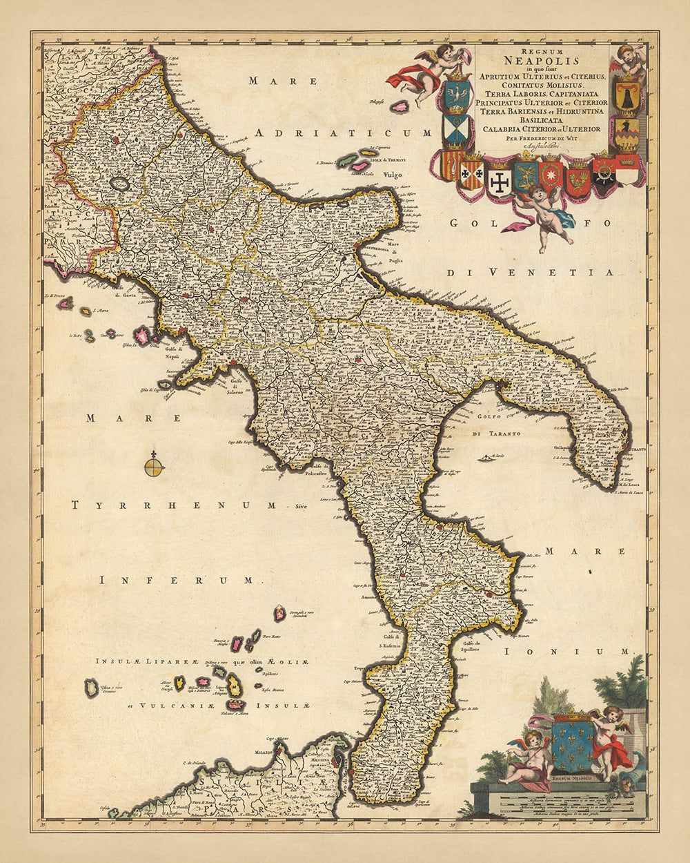 Old Map of the Kingdom of Naples, Italy by Visscher, 1690: Naples, Bari, Messina, Salerno, Parco Nazionale del Gargano