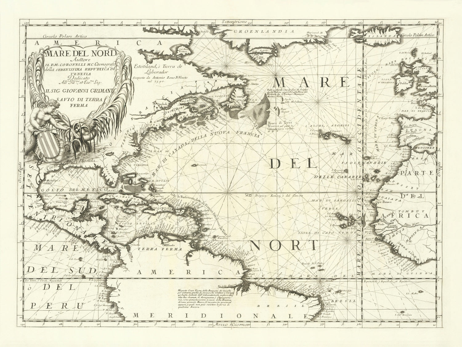 Mare Del Nord, Coronelli’s 1691 panorama of the North Atlantic world, is a study in both precision and pageantry. The chart sweeps from the European and African littorals to the shores of North and South America, braiding coasts, capes, and islands into a single navigational stage defined by crisp rhumb lines and a commanding compass rose. Greenland appears as “Groenlandia,” while Iceland retains its humanist sobriquet, “Isola di Thule,” elegantly yoking classical lore to modern reconnaissance. An ornate cartouche frames the title and authorship in high Baroque splendor, while a provocative annotation credits the Venetian Antonio Zeno with the discovery of America—an audacious historiographic gesture that threads imperial pride, scholarly rivalry, and maritime rumor into the very fabric of the sea.