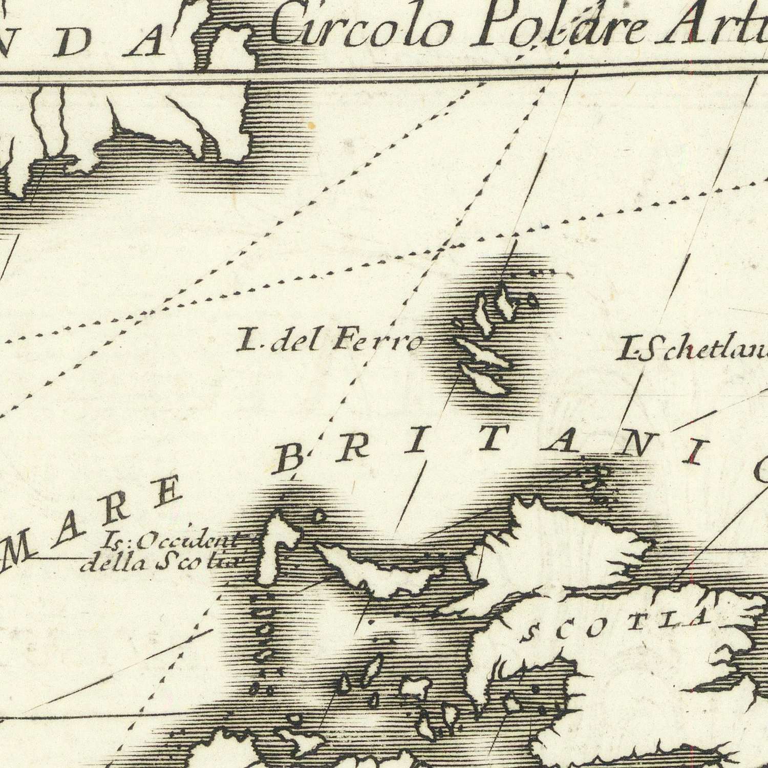 The map bears the unmistakable intellect and bravura of Vincenzo Maria Coronelli, Franciscan friar, cosmographer to the Republic of Venice, and among the most accomplished geographical minds of the seventeenth century. Revered for his monumental globes for Louis XIV and for founding the Accademia degli Argonauti, Coronelli fused empirical data with a theatrical sense of design. Issued at the moment when his Atlante Veneto was reshaping Europe’s understanding of the world, Mare Del Nord distills his method: exacting hydrographic intelligence rendered with lapidary lettering and high-contrast ornament, all organized within a navigational framework consistent with the Mercator tradition that pilots used to plot constant bearings across the oceans.