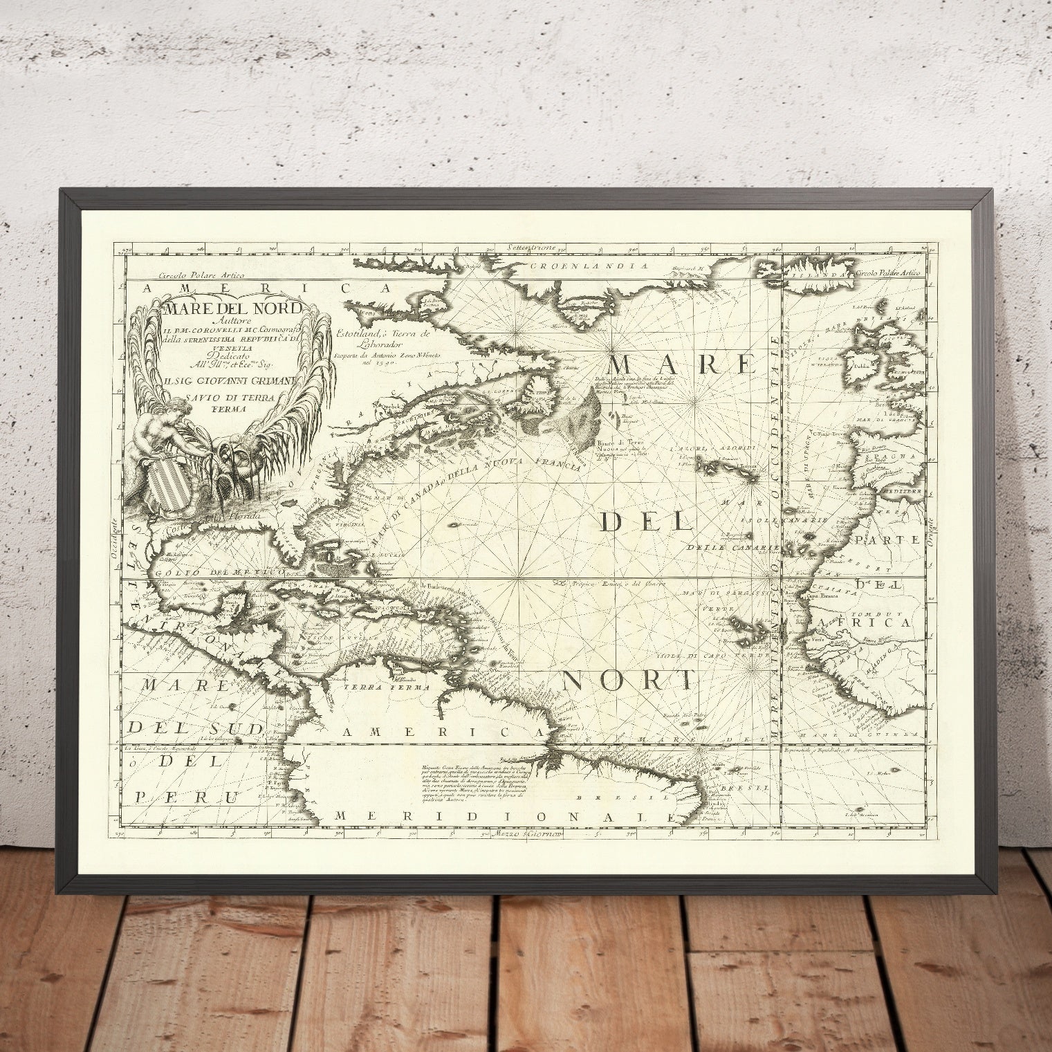 Rare Old Map of the North Atlantic by Coronelli, 1691: Mercator projection; Baroque cartouche; Antonio Zeno discovery claim