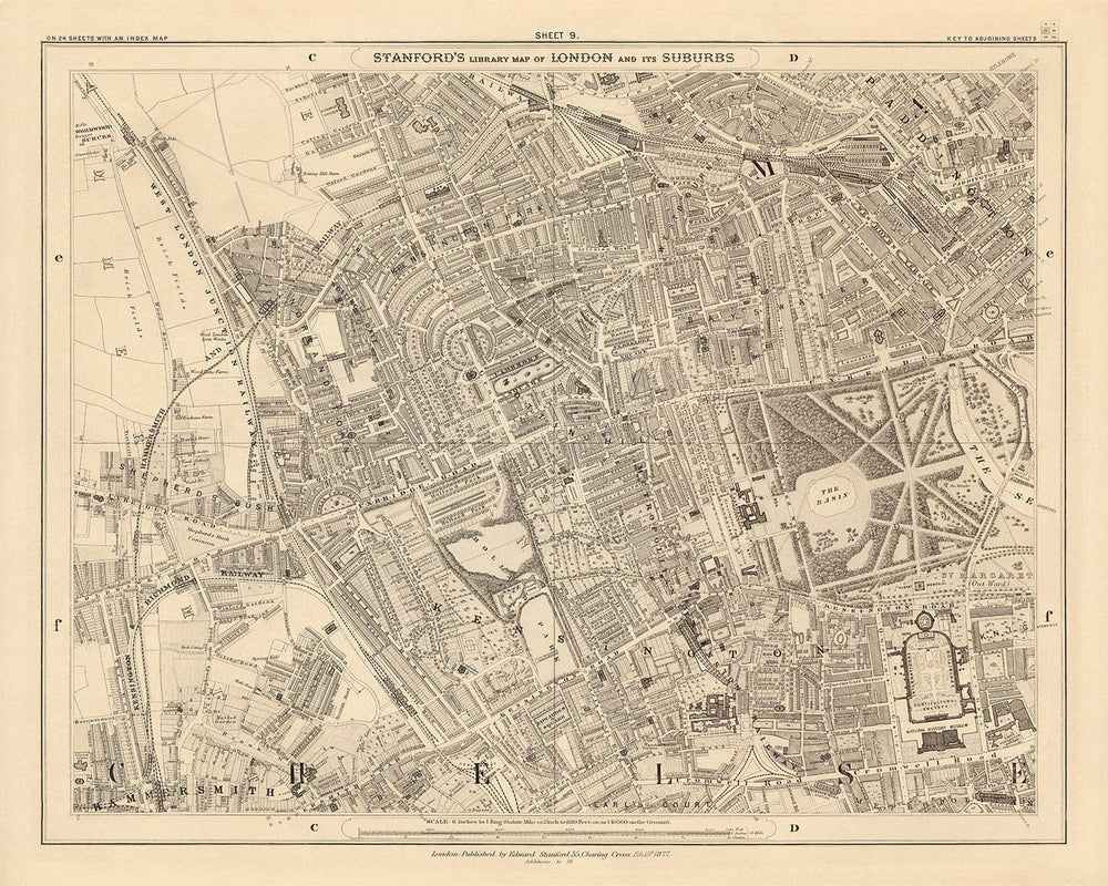 The map was originally published in 24 sheets. Altogether the map would've measured about 2 metres wide (78 inches). This here is sheet 9, which focuses on Notting Hill, Bayswater, Kensington and other parts of west London.