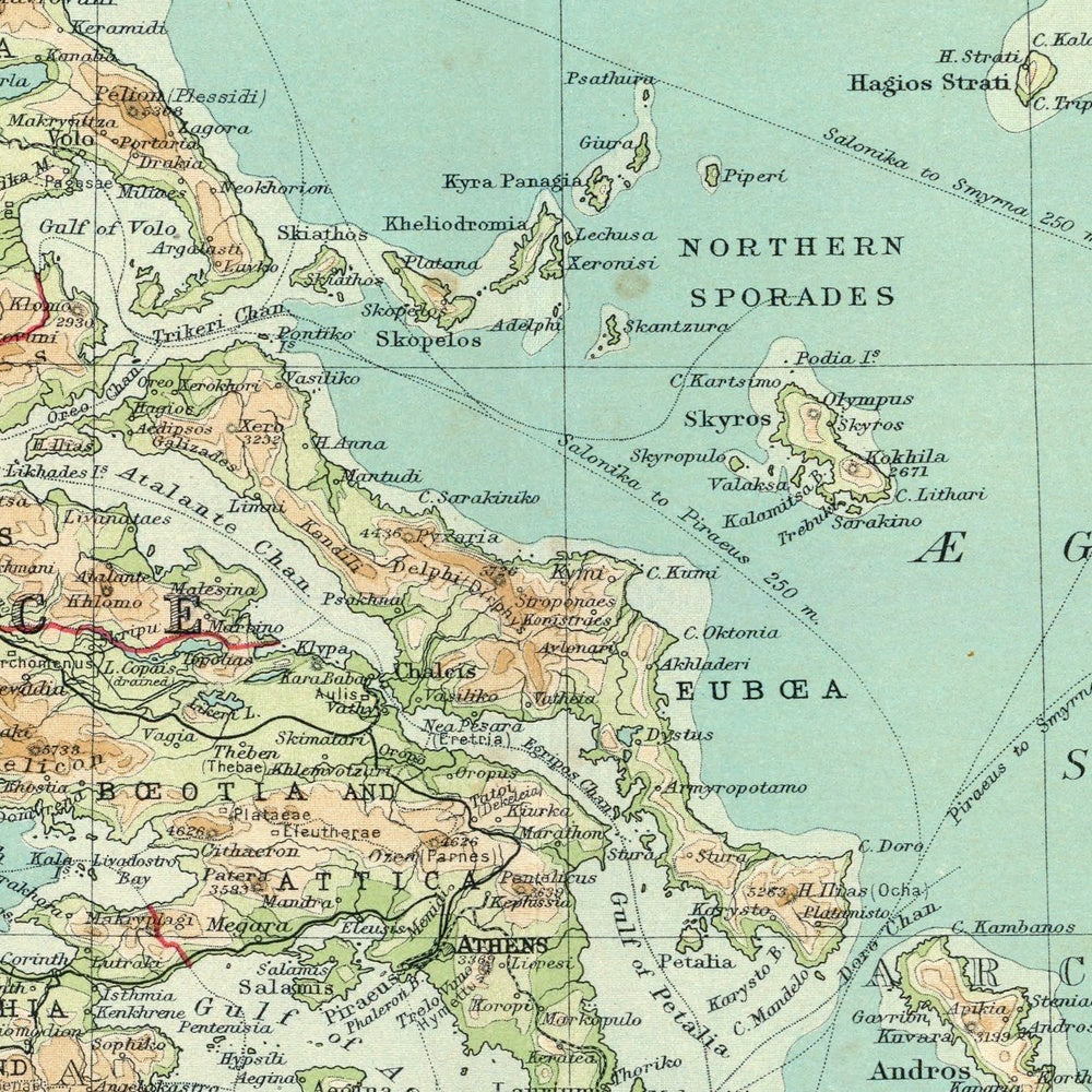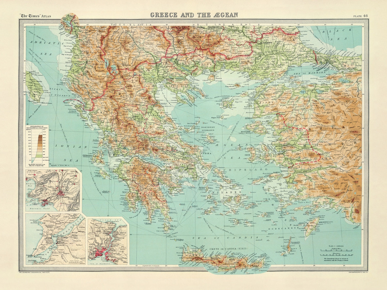 Greece and the Aegean is the original title of this 1922 masterwork from The Times atlas series, issued by The Edinburgh Geographical Institute and John Bartholomew & Son, Ltd. The second issue of the 1920 edition, it embodies John George Bartholomew’s drive to unite scientific exactitude with inviting design. Meticulously revised and corrected, the sheet assembles the political and physical geography of Greece and its maritime sphere with the clarity that made the Bartholomew name synonymous with precision. Hypsometric tints and carefully plotted spot heights render the Greek mainland and islands in lucid relief, while bathymetric shading gives the Aegean depth and contour. Across this canvas, key shipping routes are traced with purpose, tying ports, straits, and archipelagos into a coherent portrait of movement, commerce, and strategic passage.