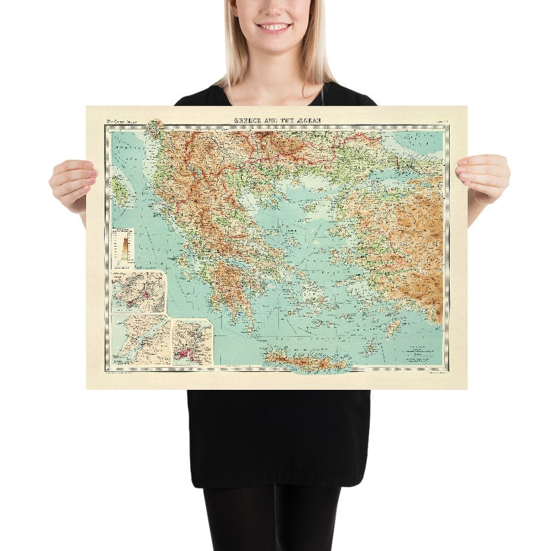 Rare Old Topographic Map of Greece & the Aegean Sea by Bartholomew, 1922: Athens, Thessaloniki, Crete, Dardanelles, Bosporus